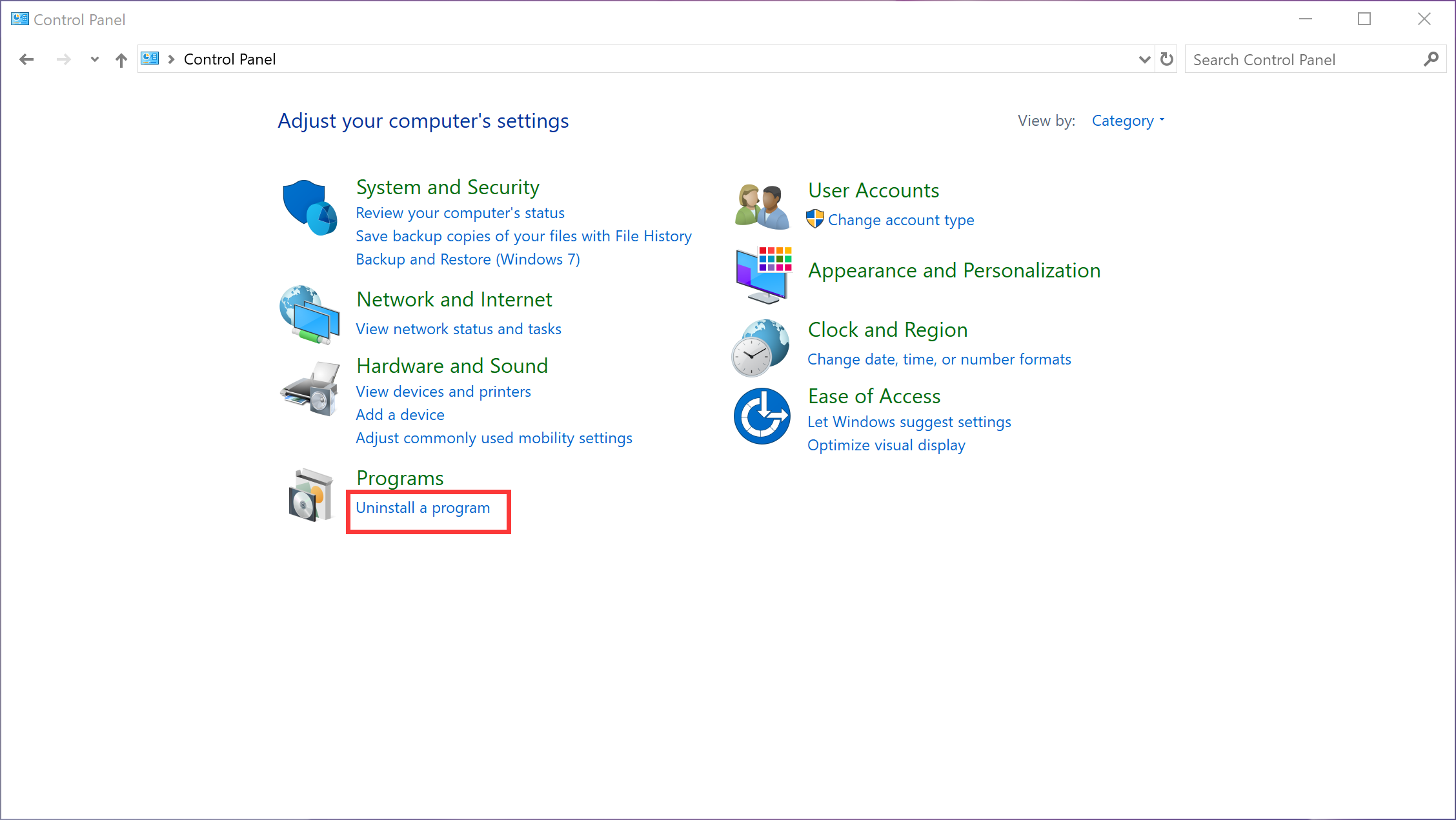 - Open it and select Uninstall a program under Programs.