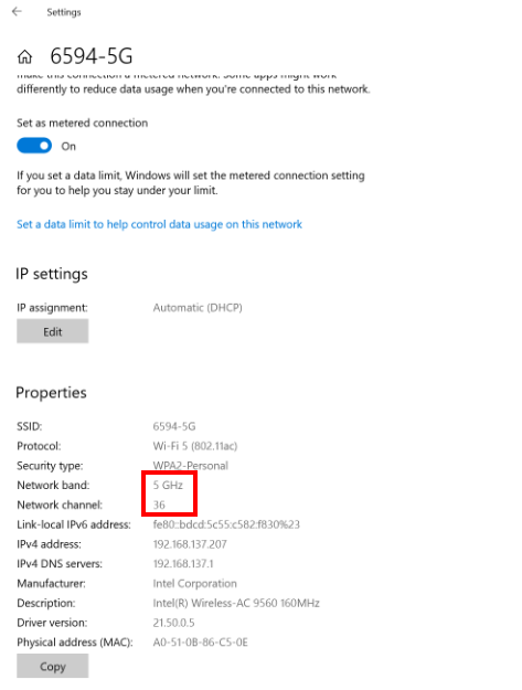 Select this hotspot in the Wi-Fi list, click Properties, and check whether Network band is displayed as 5 GHz.Project your computer's screen again.