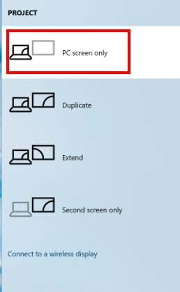 Click the Action Center icon in the bottom-right corner on the taskbar and go to Project > PC screen only.