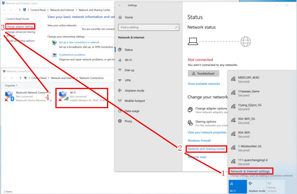 Click the Wi-Fi icon and then go to Network & Internet settings > Network and Sharing Center > Change adapter settings, right-click Wi-Fi and Disable, then click Enable.