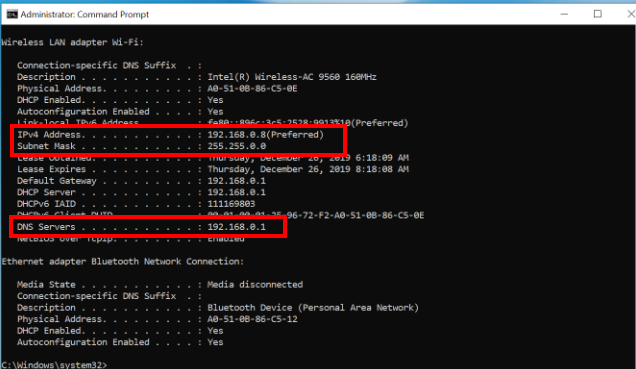 Run the cmd.exe as an administrator and run the ipconfig /all command to view information about the current network adapter.