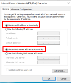 Click the Wi-Fi icon and then go to Network & Internet settings > Network and Sharing Center > Change adapter settings. Right-click Wi-Fi, select Properties, click Internet Protocol Version 4 (TCP/IPv4), and select Obtain an IP address automatically and Obtain DNS server address automatically.