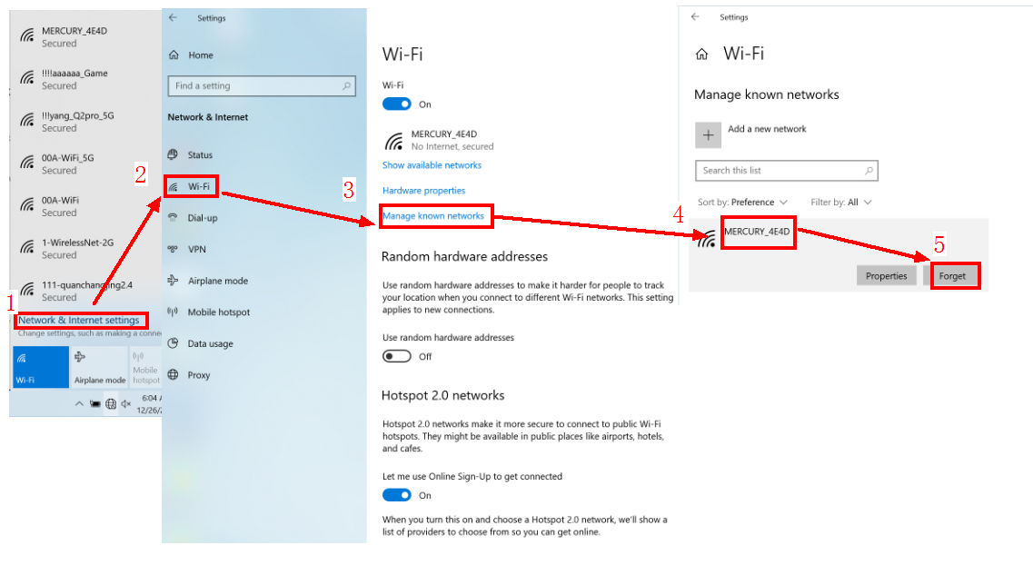 (1) Click the Wi-Fi icon in the bottom-right corner, go to Network & Internet settings > Wi-Fi > Manage known networks, then select the hotspot and click Forget.