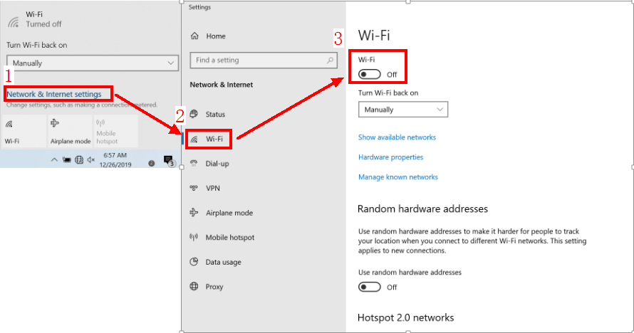 (2) To check if this issue is caused due to the Wi-Fi function being disabled, click the Wi-Fi icon on the desktop and then click Network & Internet settings > Wi-Fi.
