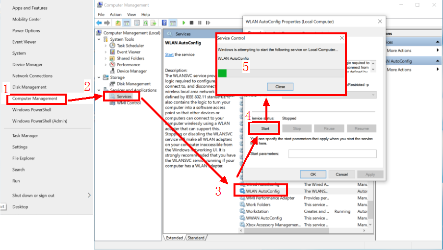 Right-click the Windows icon and then go to Computer Management > Services and Applications > Services > WLAN AutoConfig to check whether WLAN AutoConfig is running.