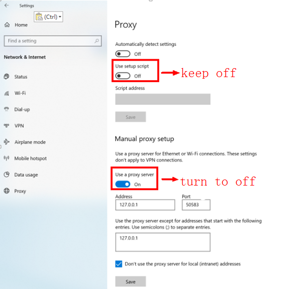 Right-click the Windows icon, go to System > Network & Internet, disable Use setup script, and enable Use a proxy server.
