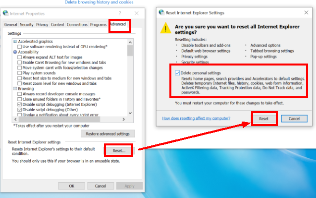 Open Internet Explorer, click the Settings icon, click Internet Options, click Connections, and remove all settings under Dial-up and Virtual Private Network settings.