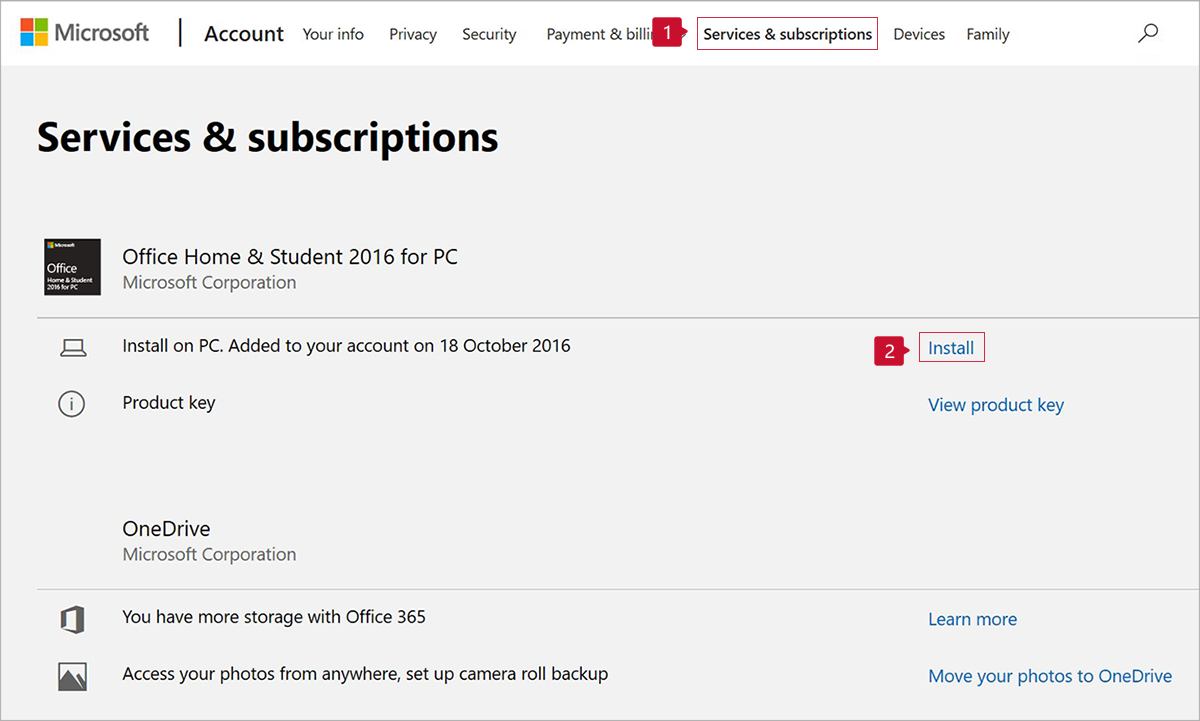 3. On the Services & subscriptions screen, click Install on the right side of the Office product and follow the onscreen instructions to install the appropriate Microsoft Office apps.