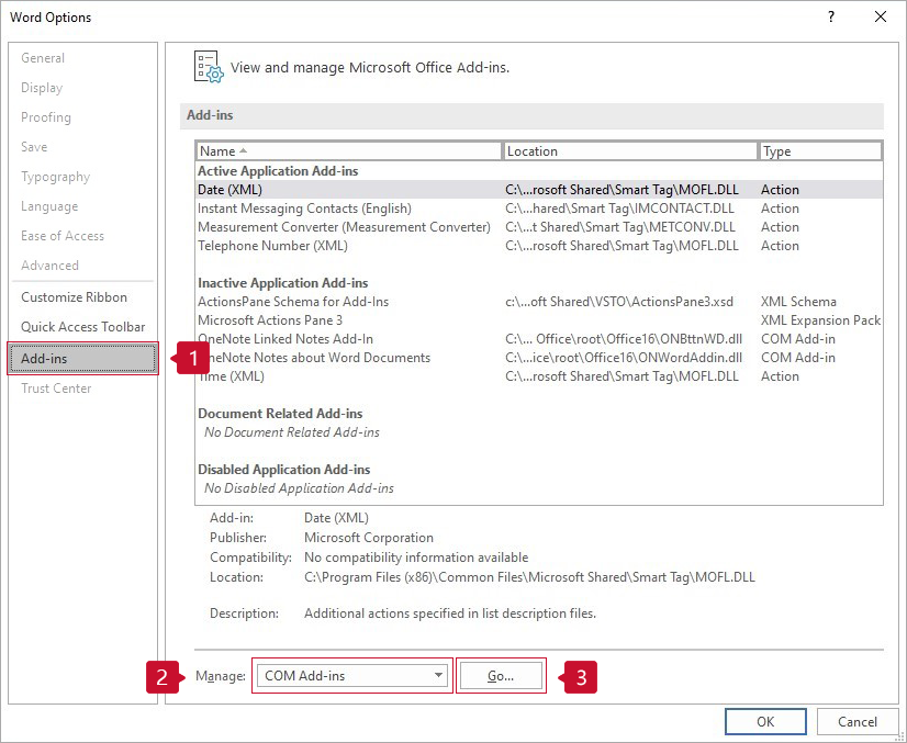 2. Select COM Add-ins after Manage and go to Go > OK .