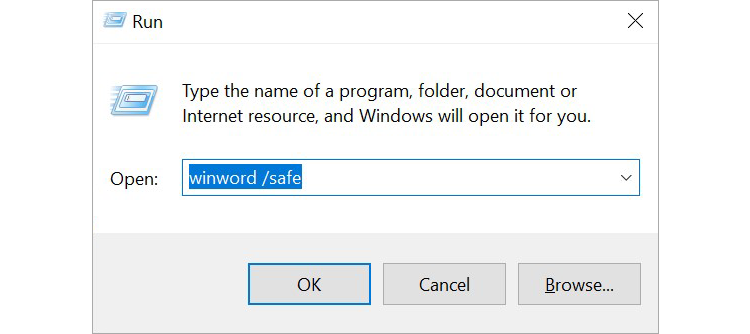 To run Word in the Run window, enter winWord /safe; to run Excel, enter excel /safe; and to run PowerPoint, enter powerpnt /safe.