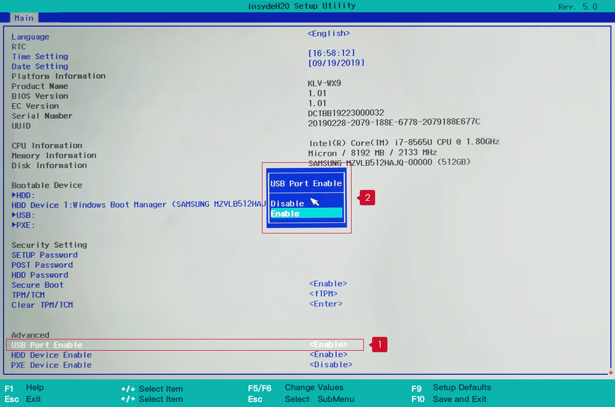 Press and hold F2 to access the BIOS settings screen, press F9 to restore the BIOS settings, and then press F10 to save the changes. The status of USB Port Enable will then be <Enable> by default.