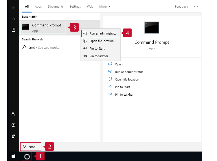 - Enter "cmd" in the search box, right-click Command Prompt, and choose Run as administrator.