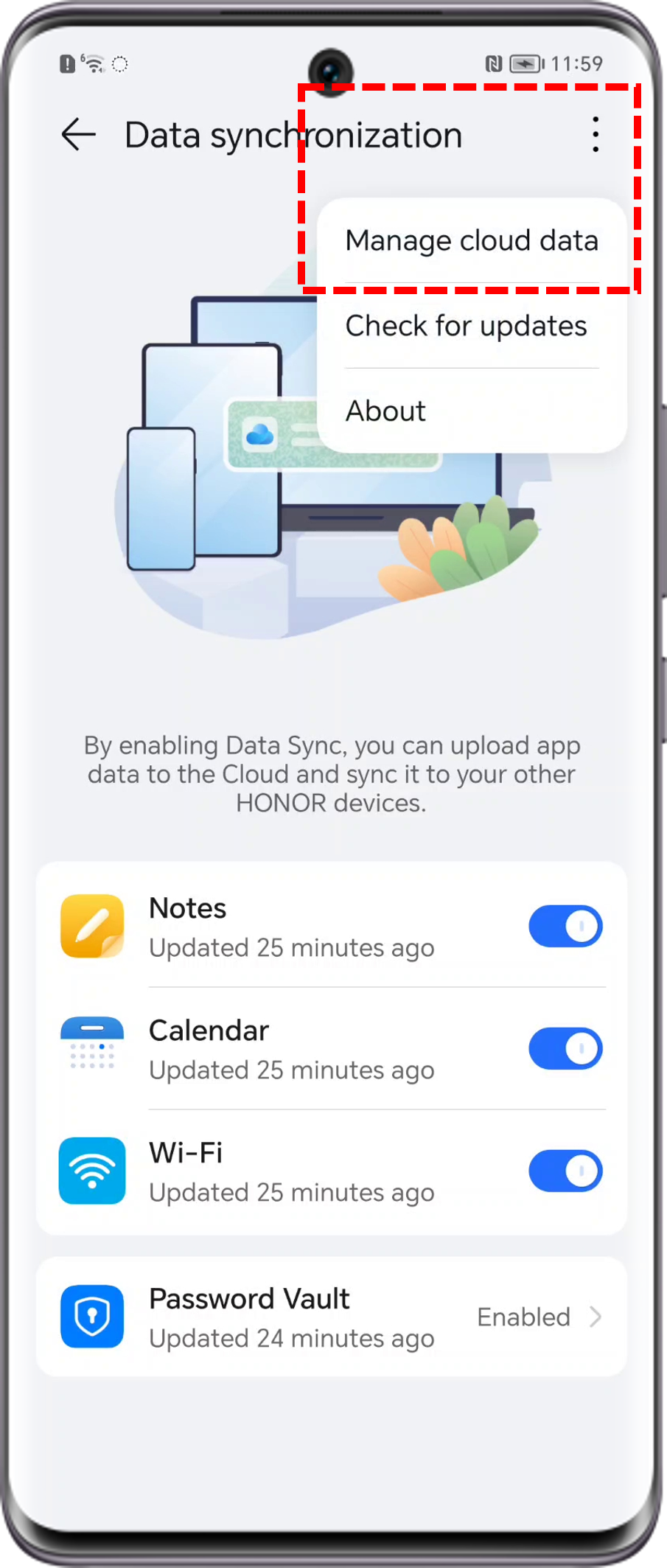 - Go to the app (such as HONOR Notes and Password Vault) to delete the data you don’t need. The cloud data will not be affected.