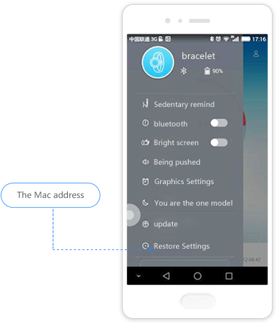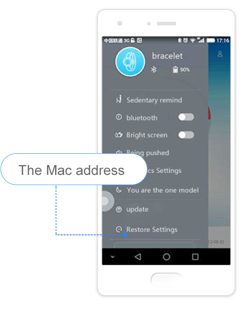 Système Android :ouvrez la page d’accueil de l’application des accessoires connectés HUAWEI > Cliquez sur l’icône dans le coin supérieur gauche pour accéder aux réglages du Band > la ligne du bas correspond à l’adresse MAC.