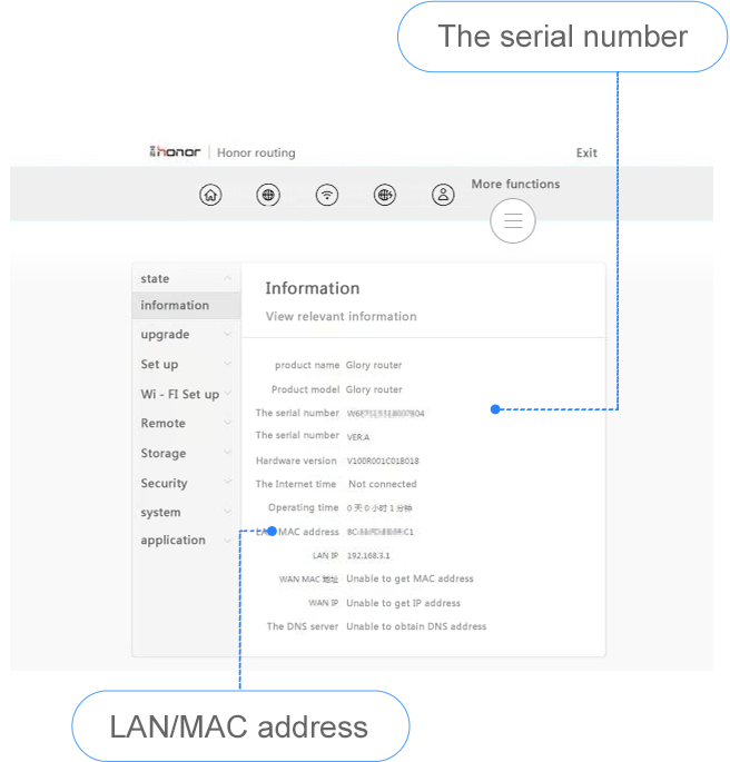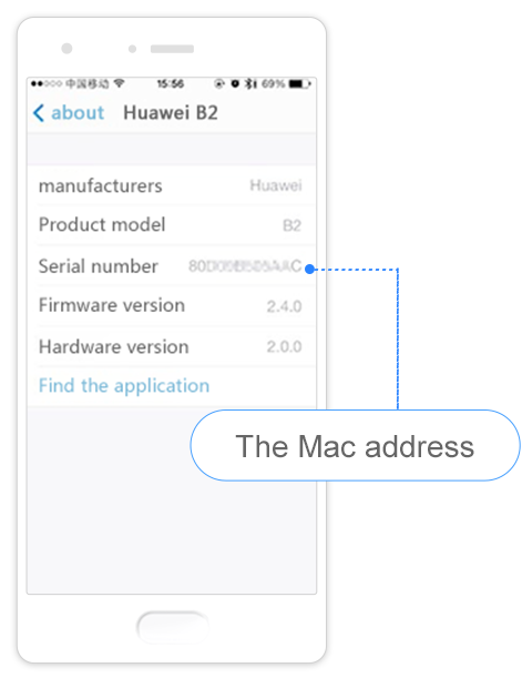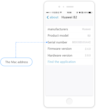 accédez à Paramètres > Paramètres généraux > À propos du périphérique > HUAWEI B2, cliquez pour afficher le « numéro de série » qui correspond à l’adresse MAC.